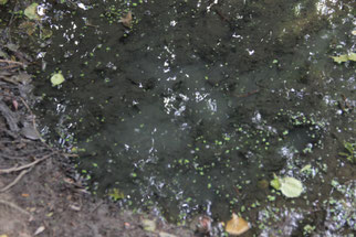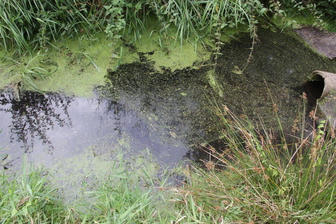 Partiell von Teichlinse freie Stellen zeigen starke Schlammbildung. Trotz nur wenigen Zentimetern Wassertiefe verhindert die Trübung den Blick auf den Gewässergrund. Starker Nährstoffeintrag wie z.B. Phosphat fördert die Wassertrübung durch Mikroalgen. Die Photosynthese in tieferen Bereichen wird behindert und das Wachstum von "normaler" Unterwasserflora und biologische Abbauprozesse am Gewässerboden gestört. Artenarmut, Schlammbildung und Algenteppiche oder großflächige Ausbreitung der Teichlinse sind die Folge: