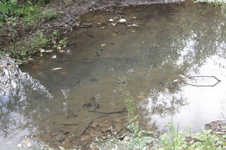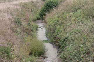 Der Mühlenbach zeigt ähnlich trübes Wasser mit schlammigem Grund ähnlich wie der Kringsgraben. Eine einzige Stelle des vom NABU Ende der 80er / Anfang der 90er Jahre angelegten Tümpelsystems führt noch etwas trübes Restwasser und bildet abseits der Bachläufe neben der nahen Auskolkung mit der Schleusenruine im Deichvorland aktuell die letzte große freie Wasserfläche: