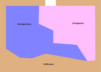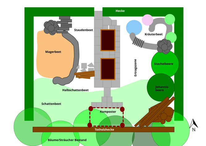 Die zur Verfügung stehende Fläche ist mit ca. 8 x 6 m relativ klein. Dennoch können alle Zonen dort problemlos abgebildet werden. Die Fläche soll die Struktur und die Funktion eines Hortus zeigen. Da die Hotspotzone und die Ertragszone möglichst sonnig liegen sollen, wurden die Zonen wie folgt angelegt. Dabei wurde die vorhandene Baum- und Strauchbepflanzung am Rand sowie die umgebende Hecke in die Pufferzone integriert.