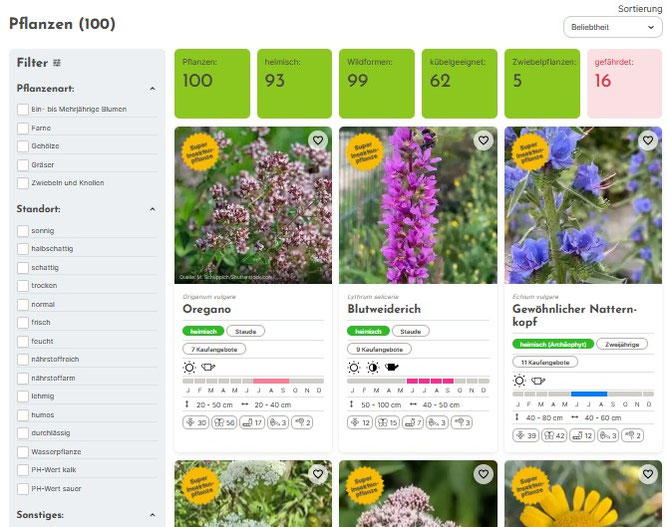 NaturaDB ist eine kostenlose Website und App, die Informationen über Pflanzen, ihre detaillierte Beschreibung und ihre ökologische Bedeutung, insbesondere für Insekten und deren Lebensräume, bietet. Im Bild unten sehen Sie den Anfang unserer Liste.